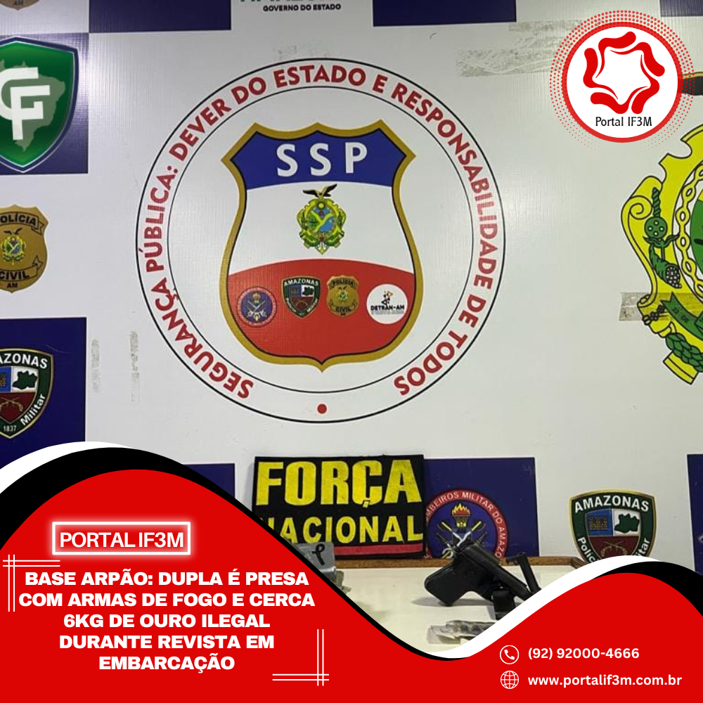 Dois homens de 56 e 58 anos foram presos por porte ilegal de arma de fogo e sonegação fiscal, na quarta-feira (05/07), na Base Fluvial Arpão, durante cumprimento da operação Hórus/Fronteira Mais Segura, coordenada pela Secretaria de Segurança Pública do Amazonas (SSP-AM). Com a dupla os policiais apreenderam uma arma de fogo e aproximadamente 6kg de ouro ilegal.
