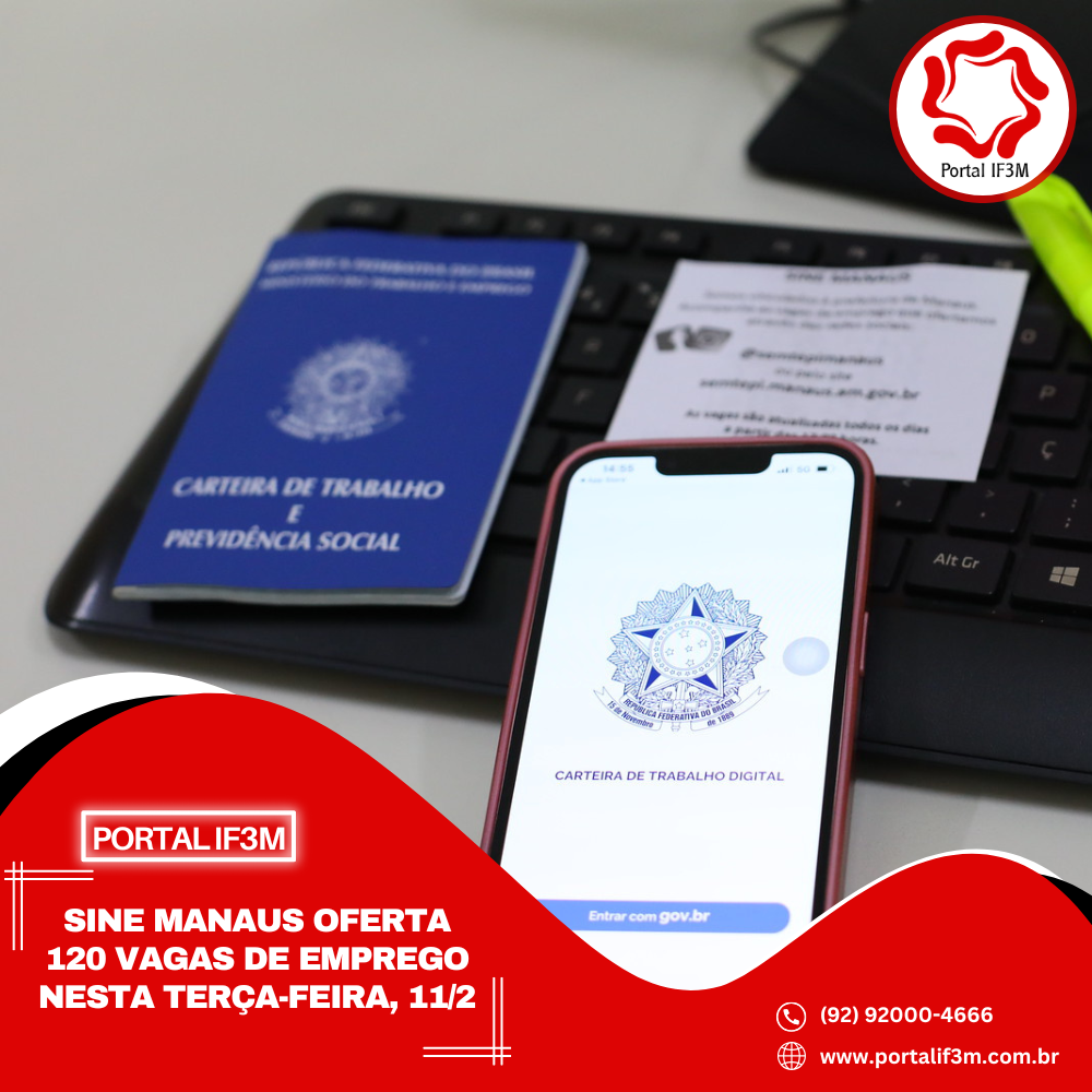 A Prefeitura de Manaus, por meio do Sine Manaus, oferta 120 vagas de emprego em várias áreas de atuação, nesta terça-feira, 11/2, de 8h às 14h. O candidato precisa validar a Carteira Digital e Previdência Social (CTPS) no aplicativo “Carteira de Trabalho Digital” ou acessar o site http://gov.br/trabalho e para concorrer às vagas, deve acessar o site http://empregabrasil.mte.gov.br para fazer a solicitação de cadastro.