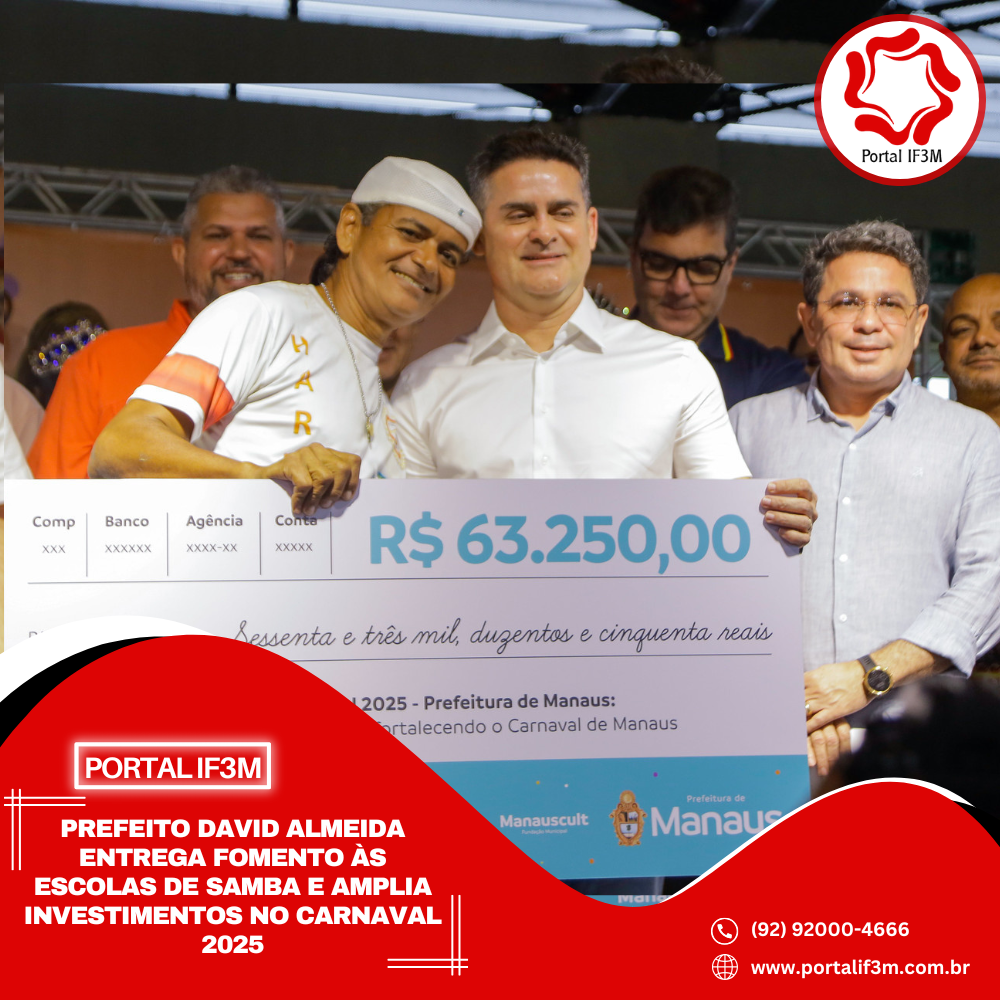 Nesta sexta-feira, 14/2, o prefeito de Manaus, David Almeida, participou do evento de entrega do fomento para as 24 escolas de samba do Carnaval 2025. A cerimônia aconteceu no mirante Lúcia Almeida, no Centro da cidade, e marcou o repasse de R$ 2.653.750,00 às agremiações, um aumento de 20% em relação ao ano anterior.