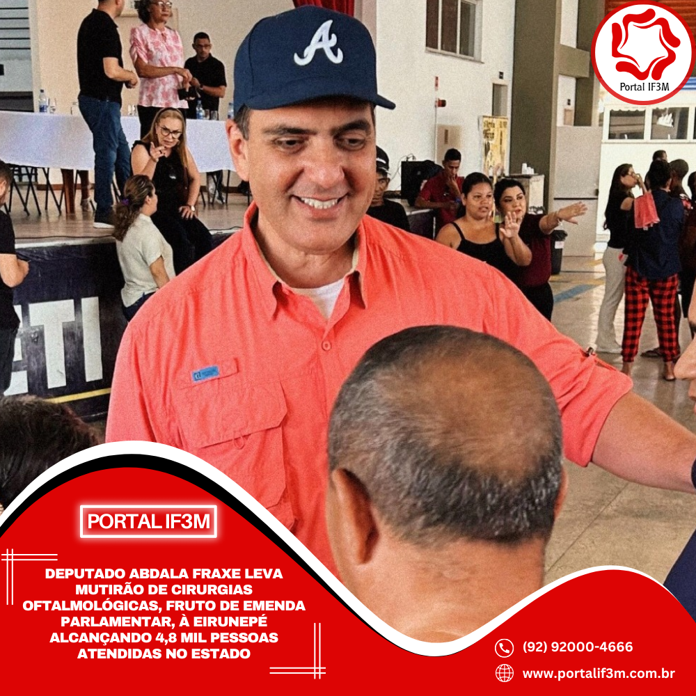 O Mutirão de Cirurgias Oftalmológicas, resultado de emenda parlamentar do deputado Abdala Fraxe (Avante), chegou à Eirunepé (distante a 1.150 quilômetros de Manaus). Mais de 200 pessoas deverão ser atendidas na ação de saúde que começou na quarta-feira (09/6) e vai até sexta-feira (11/6) no município. No total, o projeto iniciado pelo parlamentar em 2022 já atendeu 4,8 mil pessoas no interior do Estado.