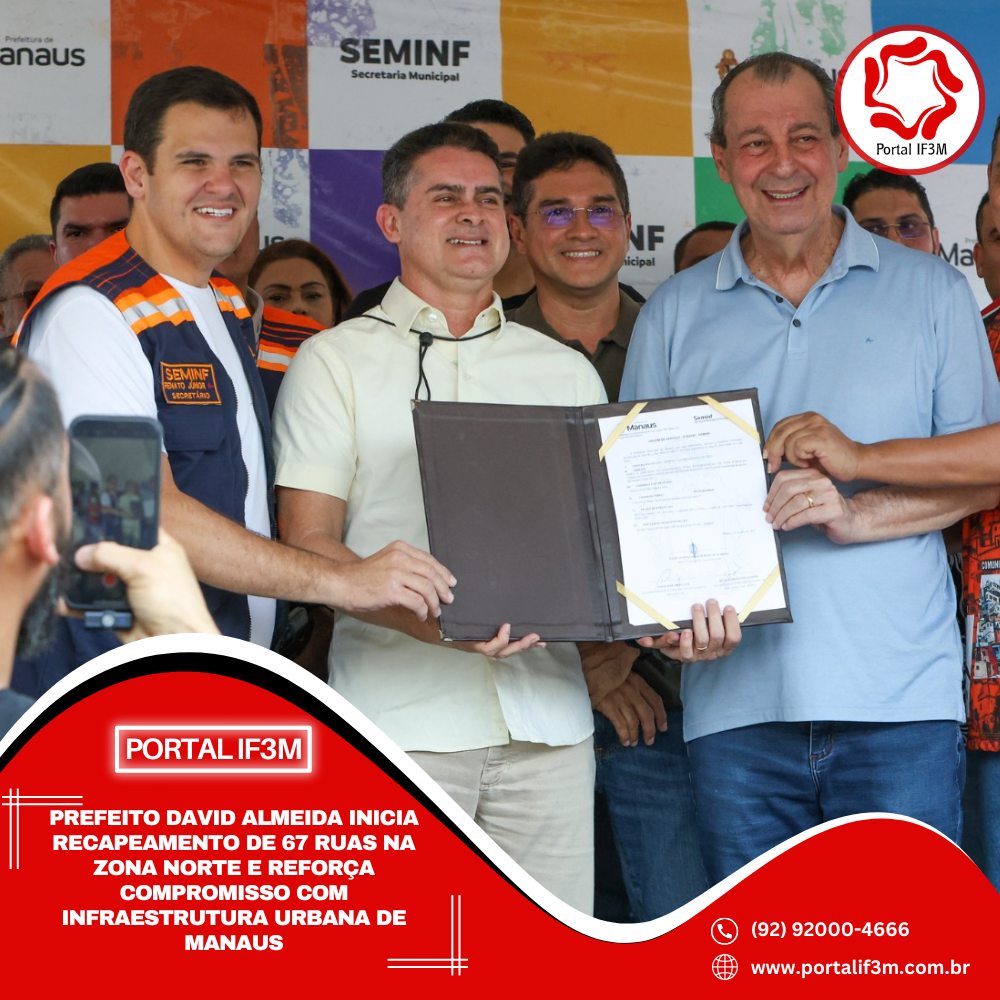 O prefeito David Almeida deu início, nesta quarta-feira, 23/7, a mais uma etapa do maior programa de recapeamento da história de Manaus, desta vez contemplando 67 ruas na zona Norte, com investimento de R$ 19.777.921,83, viabilizado por emenda do senador Omar Aziz. O lançamento aconteceu no conjunto Galileia, onde a população recebeu a comitiva municipal com entusiasmo e esperança renovada.