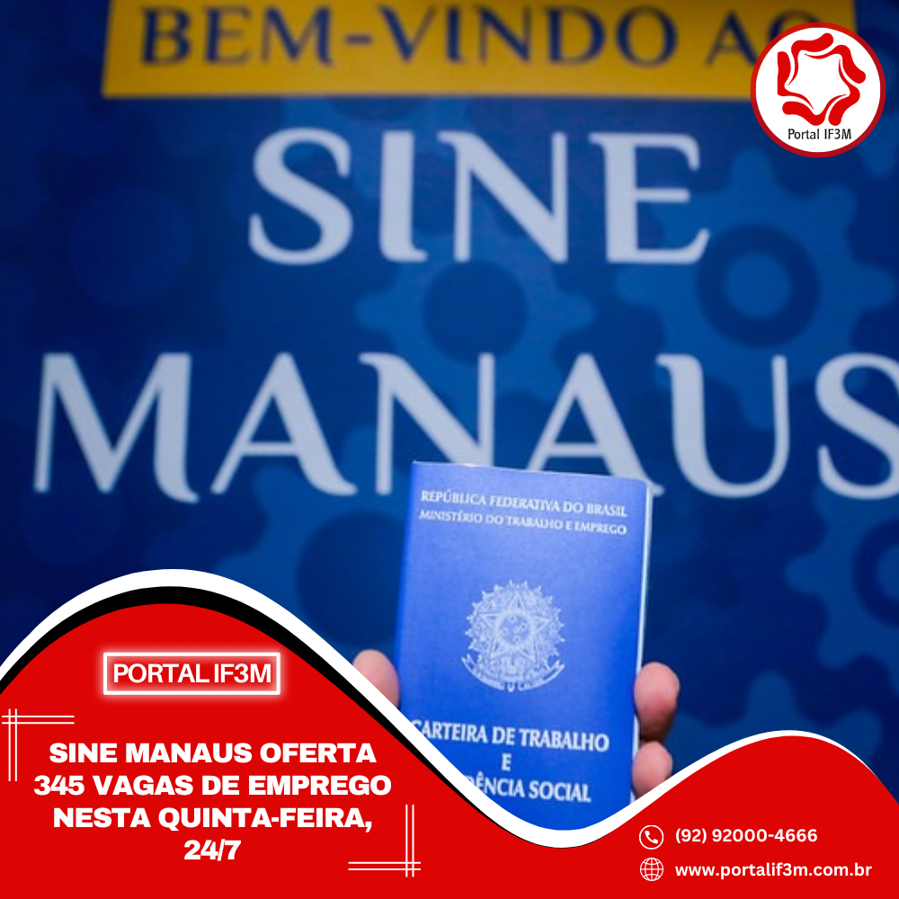 A Prefeitura de Manaus, por meio do Sine Manaus, oferta 345 vagas de emprego em várias áreas de atuação, nesta quinta-feira, 24/7, de 8h às 14h. O candidato pode validar a Carteira Digital e Previdência Social (CTPS) no aplicativo “Carteira de Trabalho Digital” ou acessar o site http://gov.br/trabalho.