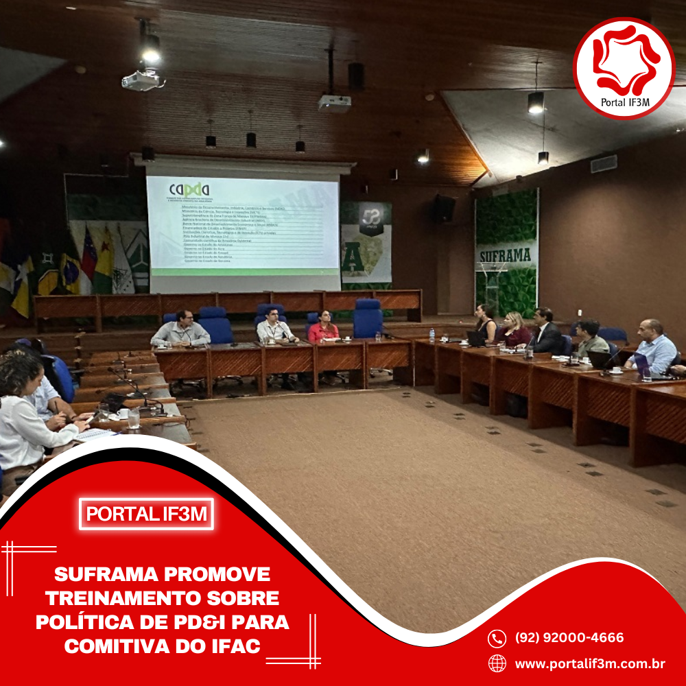 A Superintendência da Zona Franca de Manaus (Suframa) realizou, nesta quarta-feira (23), no auditório da Autarquia, um treinamento voltado à Política de Pesquisa, Desenvolvimento e Inovação (PD&I), direcionado à comitiva do Instituto Federal do Acre (Ifac), que está em visita técnica a Manaus entre os dias 23 e 25 de julho.