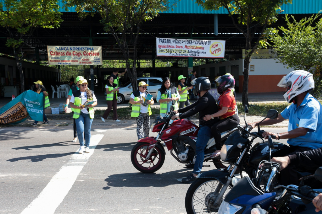 Em alusão à Semana Nacional de Prevenção a Acidentes com Motociclistas, a Prefeitura de Manaus, por meio do Instituto Municipal de Mobilidade Urbana (IMMU), realizou, na manhã desta quinta-feira, 24/7, uma ação educativa voltada a motociclistas, para orientar sobre o uso correto da área de espera exclusiva à frente dos veículos nos semáforos. A atividade foi realizada na avenida Cosme Ferreira, em frente à feira do Coroado, na zona Leste da capital.