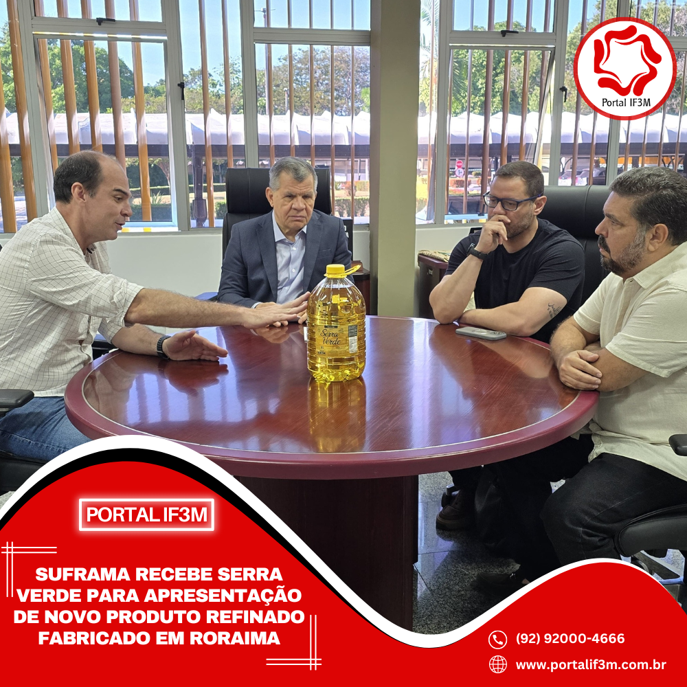 A Suframa recebeu, nesta quinta-feira (24), a visita do diretor da Agroindustrial Serra Verde, Felipe Castro, que apresentou o mais novo produto da empresa: óleo refinado em embalagens de 5 e 20 litros, fabricado em Boa Vista (RR). Trata-se do único projeto com a matéria-prima regional aprovado no Estado de Roraima e o maior fora da área da Zona Franca de Manaus (ZFM).