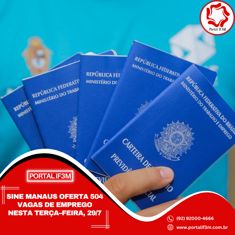 Prefeitura de Manaus, por meio do Sine Manaus, oferta 504 vagas de emprego em várias áreas de atuação, nesta terça–feira, 29/7, das 8h às 14h. O candidato pode validar a Carteira Digital e Previdência Social (CTPS) no aplicativo “Carteira de Trabalho Digital” ou acessar o site http://gov.br/trabalho.