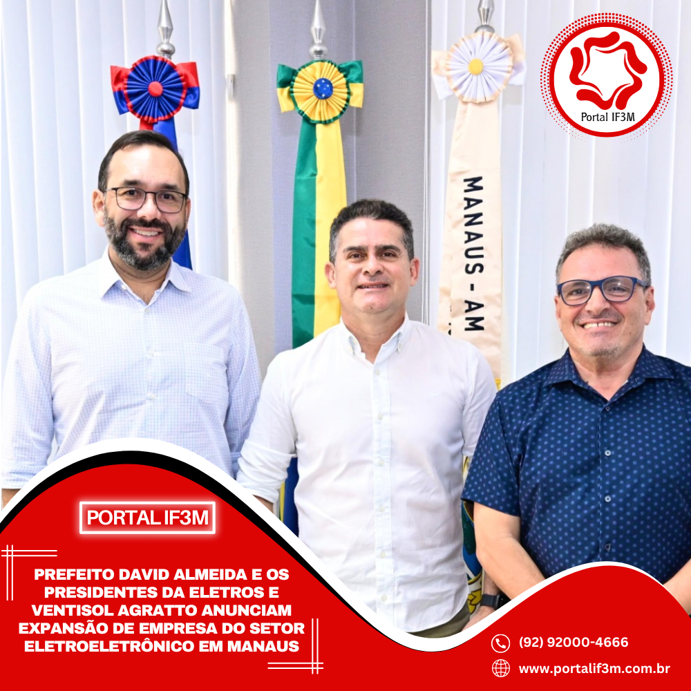 O prefeito de Manaus, David Almeida, recebeu, nesta quarta-feira, 6/8, a visita do presidente executivo da Associação Nacional de Fabricantes de Produtos Eletroeletrônicos (Eletros), Jorge Nascimento Júnior, e do presidente da Ventisol Agratto, Alexis Tcholakian, que anunciaram a expansão da fábrica na capital amazonense.