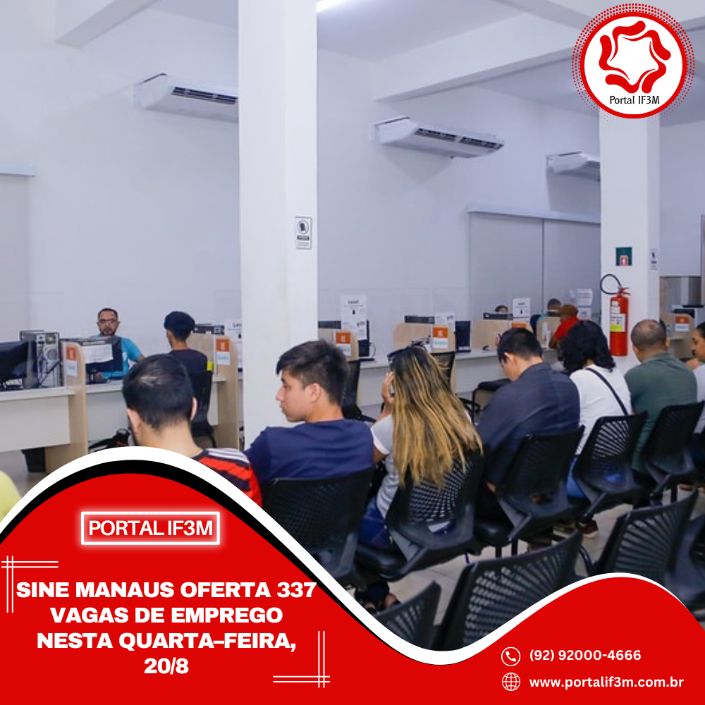 A Prefeitura de Manaus, por meio do Sine Manaus, oferta 337 vagas de emprego em várias áreas de atuação, nesta quarta–feira, 20/8, das 8h às 14h. O candidato pode validar a Carteira Digital e Previdência Social (CTPS) no aplicativo “Carteira de Trabalho Digital” ou acessar o site http://gov.br/trabalho.