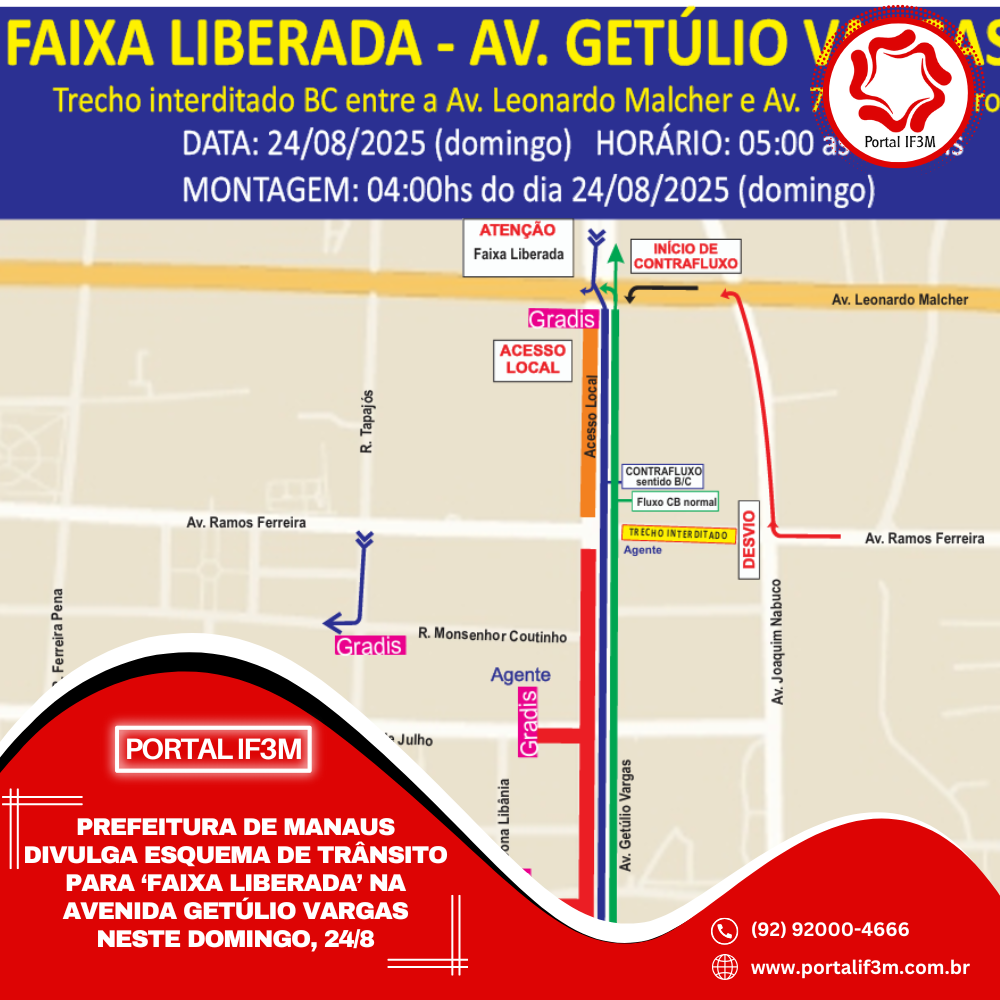 A Prefeitura de Manaus, por meio do Instituto Municipal de Mobilidade Urbana (IMMU), informa como irá funcionar o trânsito no entorno da avenida Getúlio Vargas, no Centro, zona Sul, durante a inauguração da “Faixa Liberada”, que acontece neste domingo, 24/8, das 5h às 12h. A ação faz parte do projeto “Centro Vivo” e tem como objetivo impulsionar a economia local, promovendo mais acesso e mobilidade na região central da cidade.