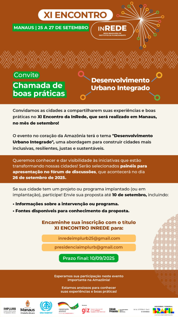 A Prefeitura de Manaus, por meio do Instituto Municipal de Planejamento Urbano (Implurb), alerta as cidades, entidades e instituições, que desejam enviar os projetos para apresentação de suas “Boas Práticas” no 11º Encontro Nacional da Rede Brasileira de Institutos de Planejamento (InREDE), que o prazo para as inscrições segue até o dia 10/9. O evento acontece de 25 a 27/9, com o tema “Desenvolvimento Urbano Integrado”.