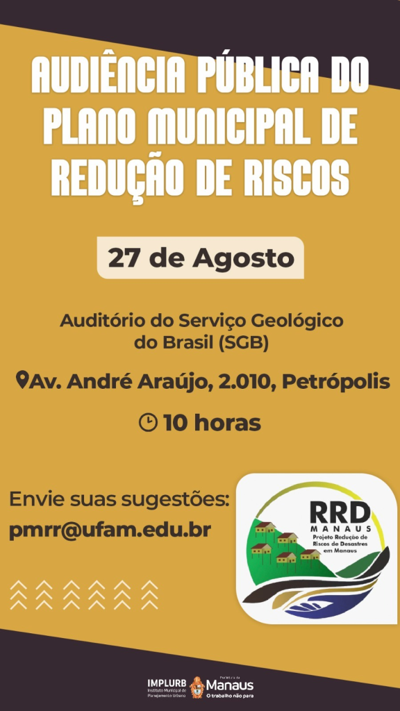 No próximo dia 27 de agosto, a sociedade civil organizada e entidades poderão participar da audiência pública do Plano Municipal de Redução de Riscos (PMRR), para apresentação dos resultados do estudo, que acontecerá no auditório do Serviço Geológico do Brasil (SGB), na avenida André Araújo, 2.010, Petrópolis, zona Sul.