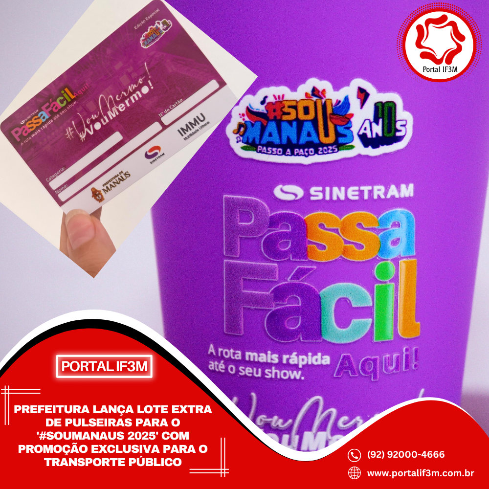 Prefeitura de Manaus, por meio da Fundação Municipal de Cultura, Turismo e Eventos (Manauscult) e do Instituto Municipal de Mobilidade Urbana (IMMU), em parceria com o Sindicato das Empresas de Transporte de Passageiros do Estado do Amazonas (Sinetram), lança um lote extra de pulseiras para o “#SouManaus Passo a Paço 2025” com uma promoção especial para quem escolher ir ao festival de ônibus. Serão disponibilizados três mil cartões PassaFácil promocionais, sendo mil para cada dia do evento.