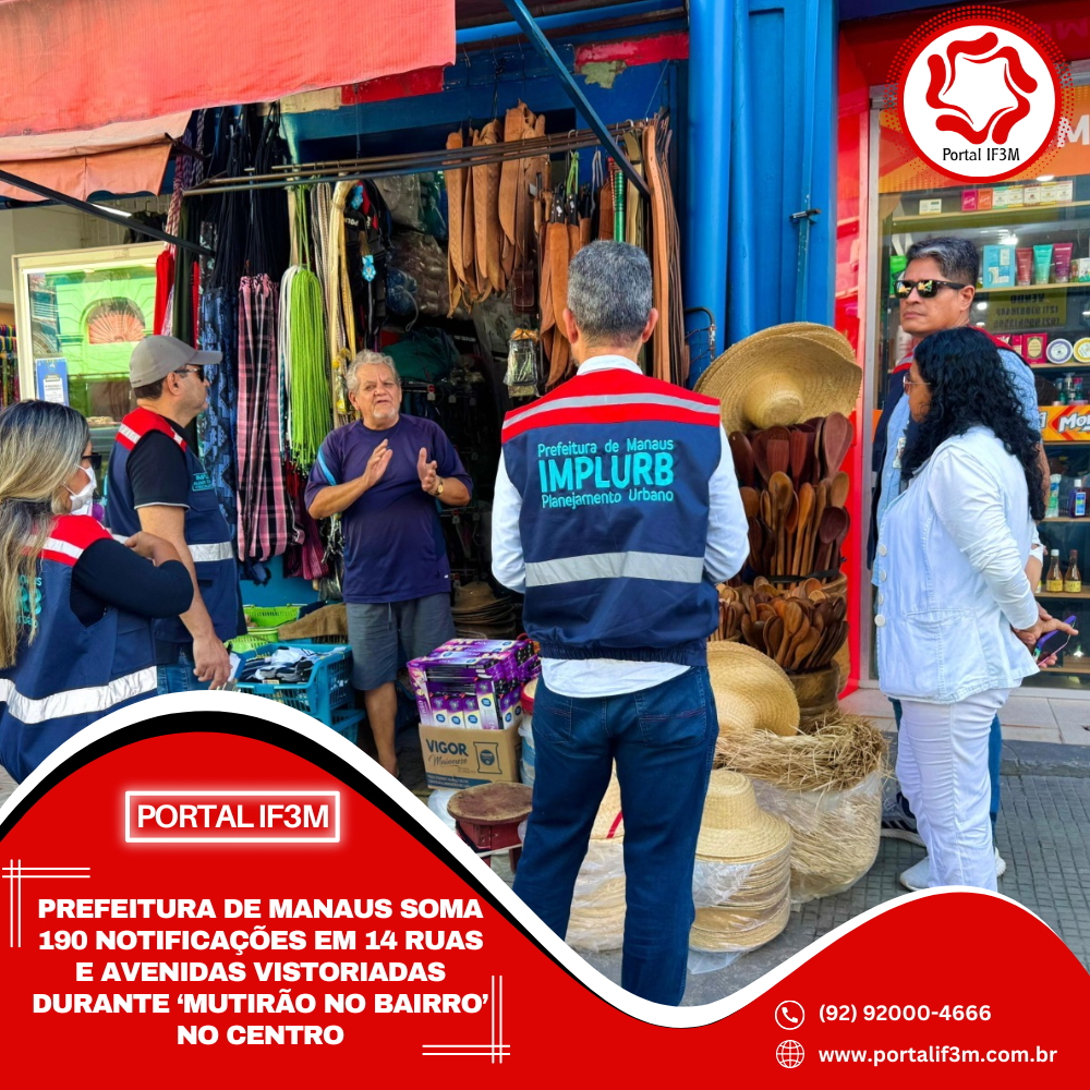 Na quarta semana desde o início do “Mutirão no Bairro” do centro histórico, uma ação inédita da Prefeitura de Manaus, o Instituto Municipal de Planejamento Urbano (Implurb) já fez 190 notificações e aplicou duas infrações por obstrução de calçada e ocupação irregular do logradouro público, na zona Sul. Os dados foram computados até a terça-feira, 27/8.