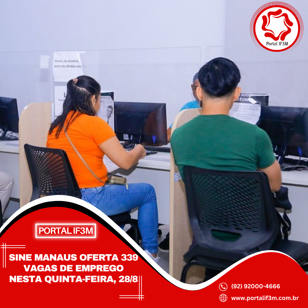 A Prefeitura de Manaus, por meio do Sine Manaus, oferta 339 vagas de emprego em várias áreas de atuação, nesta quinta-feira, 28/8, de 8h às 14h. O candidato pode validar a Carteira Digital e Previdência Social (CTPS) no aplicativo “Carteira de Trabalho Digital” ou acessar o site http://gov.br/trabalho.