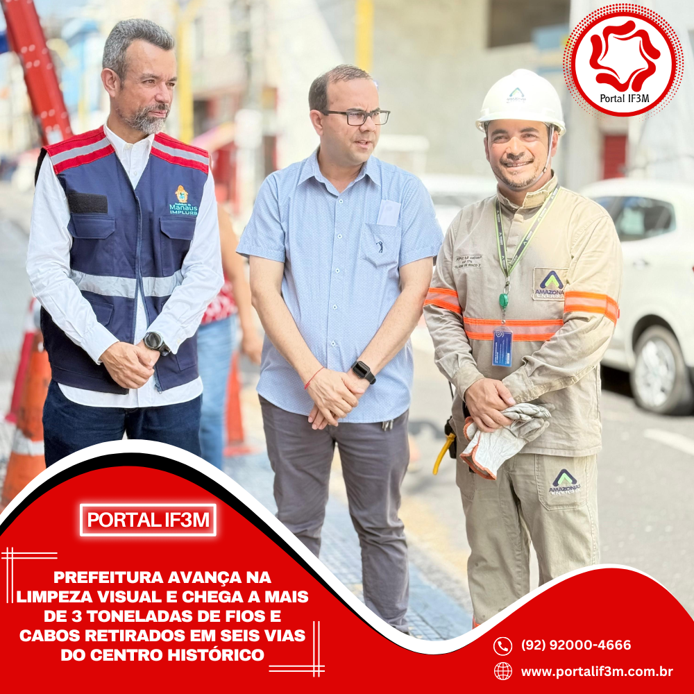 Em meio à rotina dos pedestres no tradicional comércio do centro histórico, a Prefeitura de Manaus, via Instituto Municipal de Planejamento Urbano (Implurb), segue trabalhando para devolver urbanismo, segurança e ordem às ruas do território. Nesta quarta-feira, 3/9, foi realizada a 10ª operação de retirada de fios e cabos obsoletos, alcançando a marca de mais de 3 toneladas de material removido em apenas seis vias da capital.