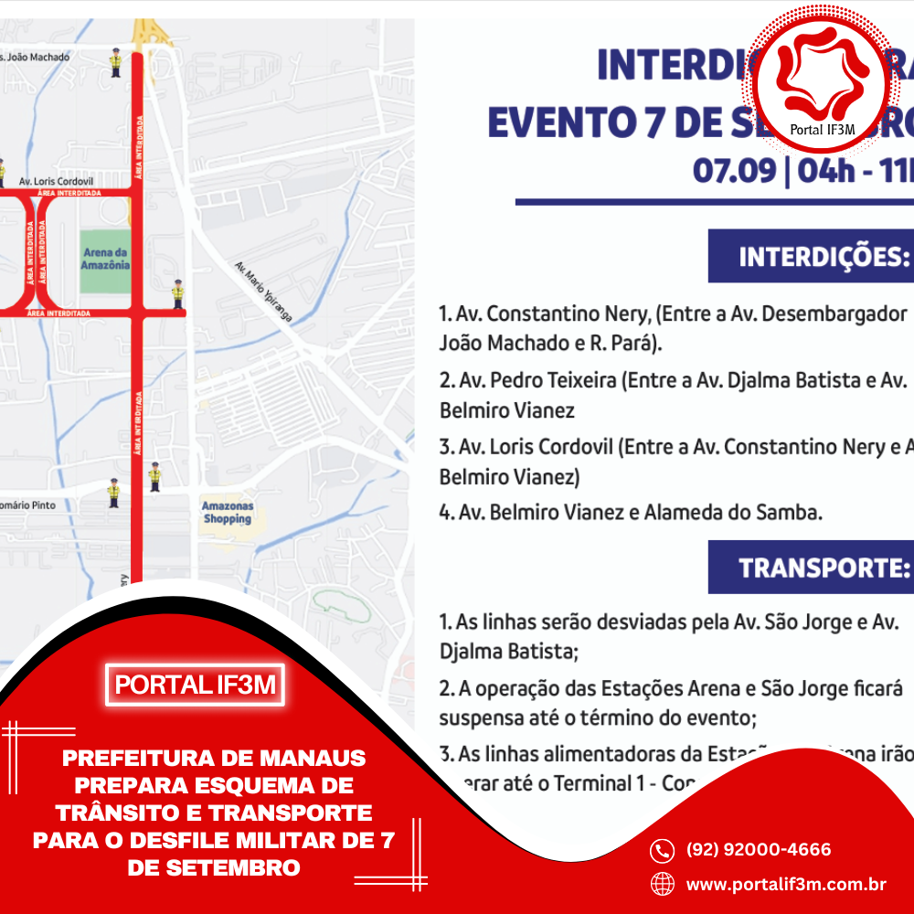 Um esquema de trânsito e transporte foi montado pela Prefeitura de Manaus, por meio do Instituto Municipal de Mobilidade Urbana (IMMU), para o Desfile Militar de 7 de setembro realizado, neste domingo, 7/9, no centro de convenções Professor Gilberto Mestrinho, o sambódromo, na zona Centro-Sul da cidade. A ação visa garantir a segurança e a mobilidade dos pedestres e dos motoristas que estarão operando os veículos das corporações.