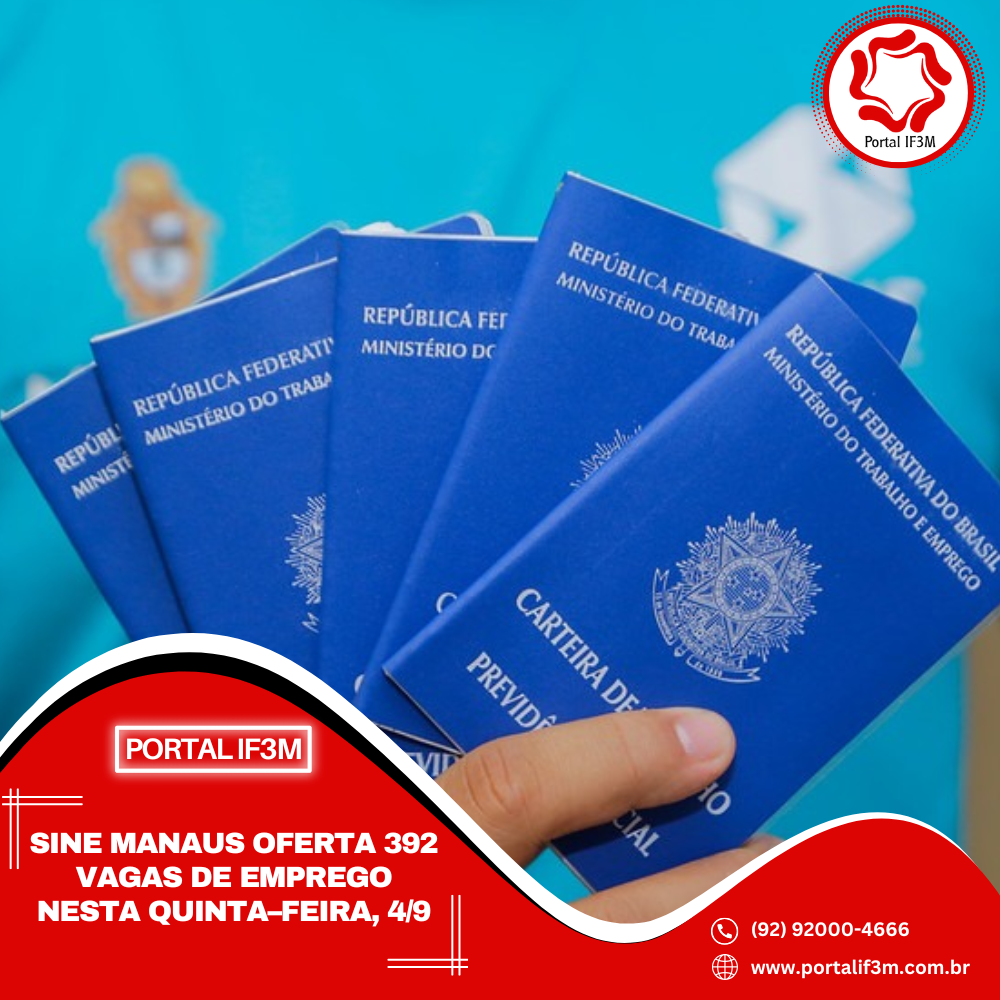 A Prefeitura de Manaus, por meio do Sine Manaus, oferta 392 vagas de emprego em várias áreas de atuação, nesta quinta–feira, 4/9, das 8h às 14h. O candidato pode validar a Carteira Digital e Previdência Social (CTPS) no aplicativo “Carteira de Trabalho Digital” ou acessar o site http://gov.br/trabalho.
