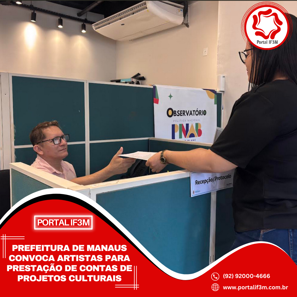 A Prefeitura de Manaus, por meio do Conselho Municipal de Cultura (Concultura), convoca todos os proponentes de projetos culturais contemplados nos editais Audiovisual e Demais Linguagens” da Lei Paulo Gustavo, assim como do edital “Manaus Faz Cultura 2023”, para comparecer à sede do Concultura nos dias 18 e 19 de setembro, das 8h às 15h, e realizar a prestação de contas dos projetos.