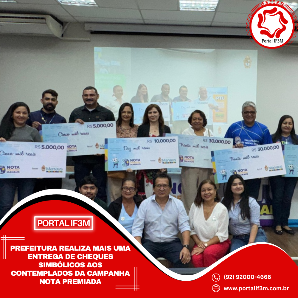 A Prefeitura de Manaus realizou mais uma premiação da campanha Nota Premiada, nesta quinta-feira, 25/9. Os 27 ganhadores do sétimo sorteio do ano, que também indicaram outras 27 Organizações da Sociedade Civil (OSCs), receberam os cheques simbólicos, que totalizaram R$ 200 mil em prêmios. O evento aconteceu no auditório da Subsecretaria da Receita da Secretaria Municipal de Finanças, Planejamento e Tecnologia da Informação (Semef).