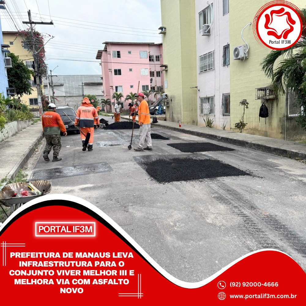 A Prefeitura de Manaus, por meio da Secretaria Municipal de Infraestrutura (Seminf), realizou, nesta quarta-feira, 1º/10, a manutenção asfáltica da rua 5 do conjunto Viver Melhor III, localizado na comunidade Braga Mendes, do bairro Cidade de Deus.
