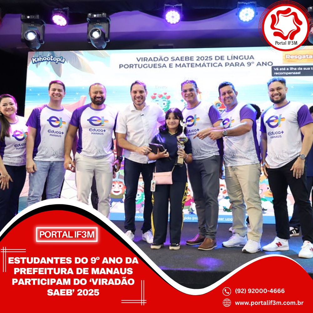 A Prefeitura de Manaus, por meio da Secretaria Municipal de Educação (Semed), dá continuidade, nesta quinta-feira, 9/10, ao “Viradão Saeb” 2025, desta vez voltado para os alunos do 9º ano da rede municipal de ensino. A iniciativa acontece de forma presencial no auditório da sede da Semed, na avenida Maceió, no bairro Parque 10 de Novembro, zona Centro-Sul da capital, e transmitido pelo YouTube, no canal oficial da Semed.