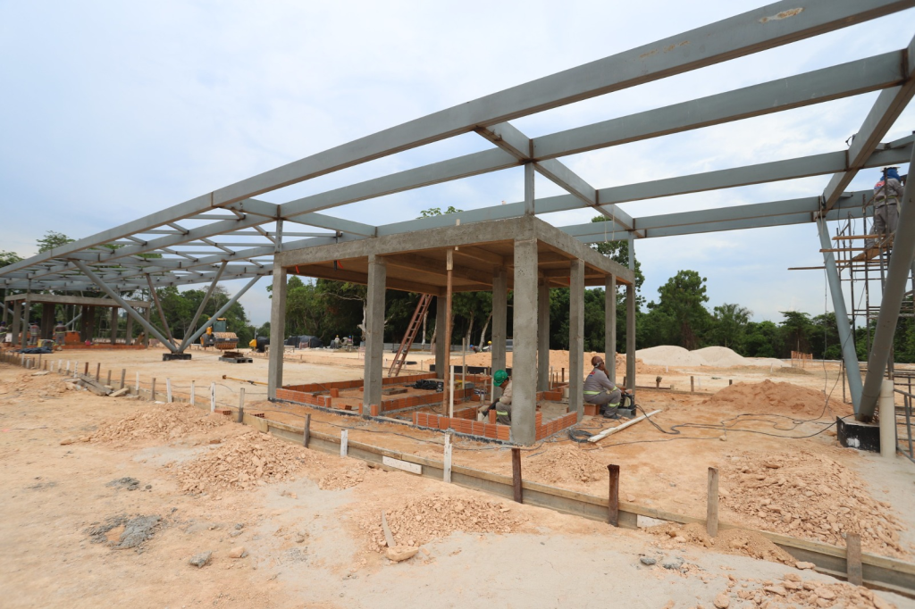 Simultaneamente, a fundação da construção da administração e guarita estão sendo iniciadas, e os quiosques estão na etapa de finalização da cobertura metálica e dos trabalhos de estruturas hidrosanitárias, elétrica e águas pluviais.