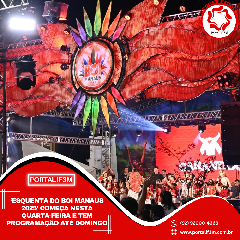 A Prefeitura de Manaus, por meio da Fundação Municipal de Cultura, Turismo e Eventos (ManausCult), anuncia mais uma etapa da programação do “Boi Manaus 2025”, que entra em uma nova fase, a partir desta quarta-feira, 15/10, com o início do “Esquenta do Boi Manaus”, no bloco E, do centro de convenções Professor Gilberto Mestrinho (sambódromo). A programação será a continuidade da “Feirinha do Tururi”, que movimentou o mirante Lúcia Almeida, no Centro, com sucesso de público e valorização da cultura popular.