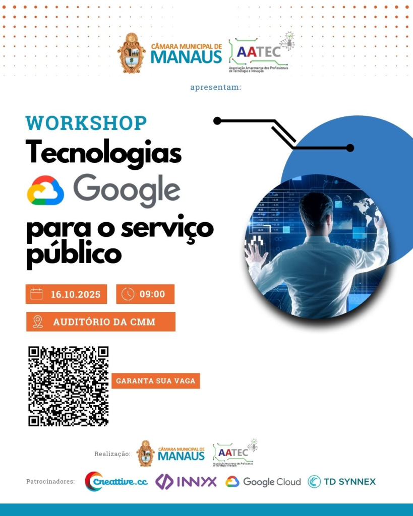 A Câmara Municipal de Manaus (CMM), em parceria com a Associação Amazonense de Profissionais de Tecnologia e Inovação (AATEC), realiza, nesta quinta-feira (16 de outubro), às 9h, no auditório Zany dos Reis, o ‘Workshop de Tecnologias Google para Servidores Públicos’, voltado aos profissionais da área de Tecnologia da Informação dos órgãos públicos.
