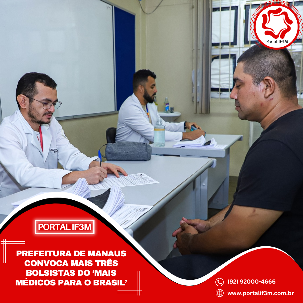 A Prefeitura de Manaus convoca mais três bolsistas do Programa Mais Médicos para o Brasil (PMMB), selecionados para atuação no município, no 41º ciclo do programa federal, 3ª chamada. Os profissionais devem se apresentar na sede da Secretaria Municipal de Saúde (Semsa) para os procedimentos admissionais, no período de 20 a 28/10.