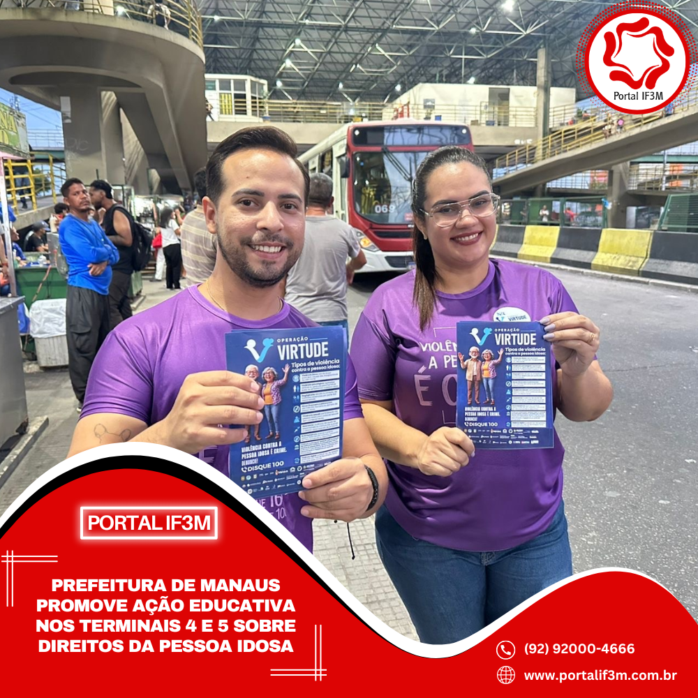 A Prefeitura de Manaus, por meio da Fundação de Apoio ao Idoso Dr. Thomas (FDT), realizou, na terça-feira, 21/10, uma ação educativa nos terminais de integração 4 e 5, localizados nos bairros Jorge Teixeira e São José Operário, nas zonas Norte e Leste da cidade. A atividade integrou a programação da operação nacional “Virtude”, com o objetivo de promover o respeito, a valorização e a defesa dos direitos da pessoa idosa em todo o país.