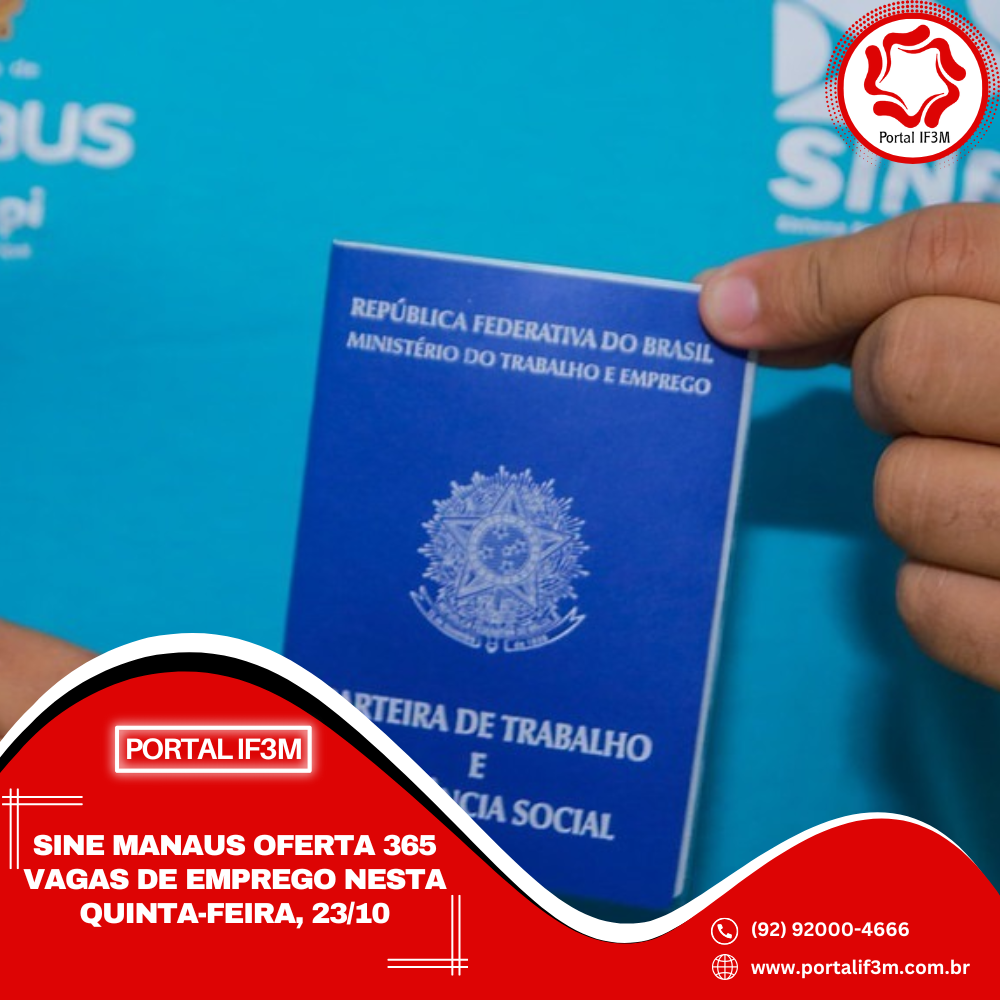 A Prefeitura de Manaus, por meio do Sine Manaus, oferta 365 vagas de emprego em várias áreas de atuação, nesta quinta-feira, 23/10, das 8h às 14h. O candidato pode validar a Carteira Digital e Previdência Social (CTPS) no aplicativo “Carteira de Trabalho Digital” ou acessar o site http://gov.br/trabalho.
