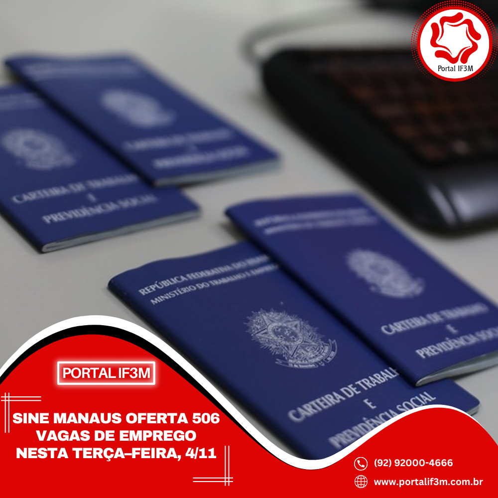 Prefeitura de Manaus, por meio do Sine Manaus, oferta 506 vagas de emprego em várias áreas de atuação, nesta terça-feira, 4/11, das 8h às 14h. O candidato pode validar a Carteira Digital e Previdência Social (CTPS) no aplicativo “Carteira de Trabalho Digital” ou acessar o site http://gov.br/trabalho.