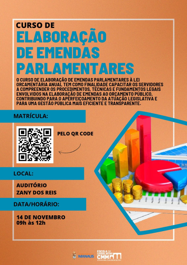 A Câmara Municipal de Manaus (CMM), por meio da Escola do Legislativo Vereadora Léa Alencar Antony, realiza nesta sexta-feira (14 de novembro), no auditório Zany dos Reis, o curso de Elaboração de Emendas Parlamentares à Lei Orçamentária Anual (LOA). A capacitação tem como objetivo aprimorar o conhecimento técnico dos servidores da Casa sobre os procedimentos, fundamentos legais e metodologias de elaboração de emendas ao orçamento público.