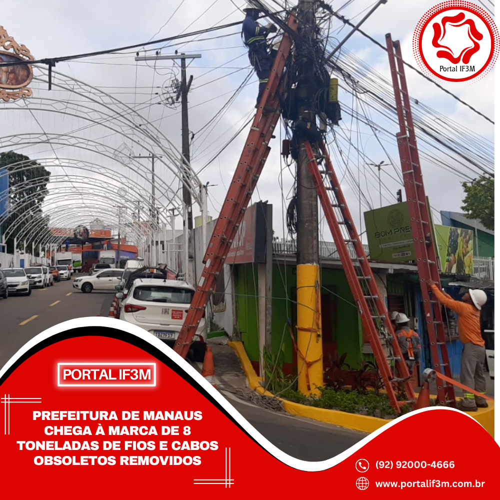 A Prefeitura de Manaus, Instituto Municipal de Planejamento Urbano (Implurb), avança com as ações de revitalização urbana, a partir da retirada de fios e cabos obsoletos, alcançando a marca de 8 toneladas de material removido em toda a cidade. Nesta quinta-feira, 13/11, as equipes estiveram no bairro Compensa, zona Oeste, em frente à sede da Secretaria Municipal de Limpeza Urbana (Semulsp), na primeira intervenção fora da área central.