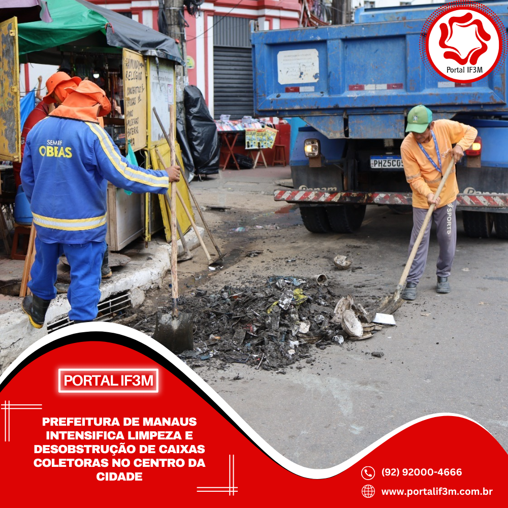 A Prefeitura de Manaus, por meio da Secretaria Municipal de Infraestrutura (Seminf), atua, nesta quinta-feira, 13/11, de forma intensiva, na rua Marechal Deodoro e na avenida Floriano Peixoto, no Centro, zona Sul, com serviços de limpeza e desobstrução das caixas coletoras. As equipes realizam a remoção de grande quantidade de resíduos descartados irregularmente, que comprometem o escoamento adequado das águas pluviais e podem causar alagamentos durante o período chuvoso.