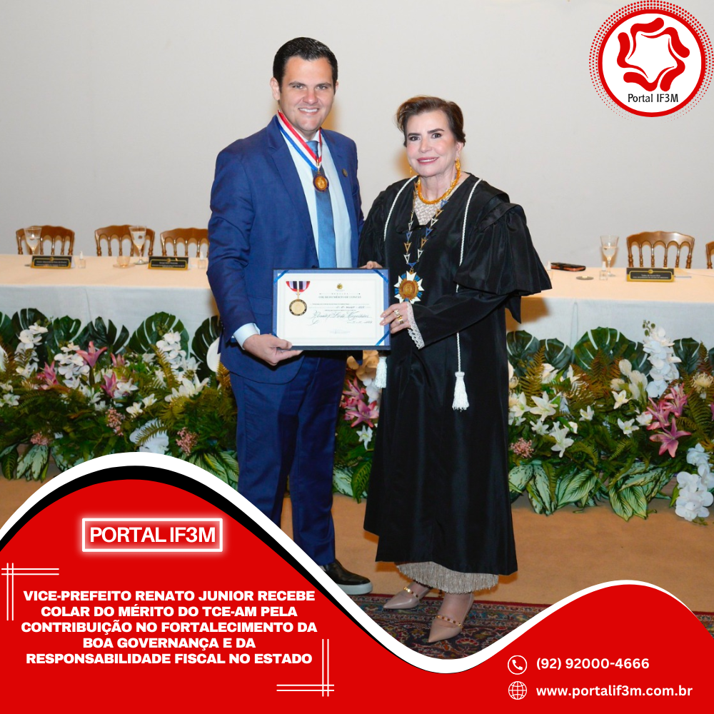 O vice-prefeito de Manaus, Renato Junior, recebeu, nesta sexta-feira, 14/11, o Colar do Mérito de Contas, honraria que é entregue pelo Tribunal de Contas do Estado do Amazonas (TCE-AM) a personalidades que contribuíram de forma expressiva para o fortalecimento da boa governança e da responsabilidade fiscal no Estado.