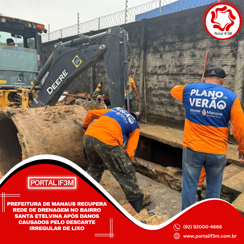 A Prefeitura de Manaus, por meio da Secretaria Municipal de Infraestrutura (Seminf), executou, nesta segunda-feira, 29/12, a manutenção da rede de drenagem profunda da rua Nossa Senhora de Fátima, no bairro Santa Etelvina, zona Norte da capital. A área apresentou afundamento na lateral da via em decorrência do desanelamento da tubulação, provocado pelo acúmulo de lixo descartado de forma irregular.