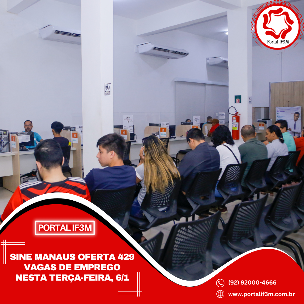 A Prefeitura de Manaus, por meio do Sine Manaus, oferta 429 vagas de emprego em várias áreas de atuação, nesta terça-feira, 6/1, das 8h às 14h. O candidato pode validar a Carteira Digital e Previdência Social (CTPS) no aplicativo “Carteira de Trabalho Digital” ou acessar o site http://gov.br/trabalho.