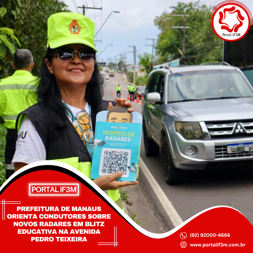 A Prefeitura de Manaus, por meio do Instituto Municipal de Mobilidade Urbana (IMMU), realizou, nesta quarta-feira, 14/1, uma blitz educativa na avenida Pedro Teixeira, no bairro Dom Pedro, zona Centro-Oeste da capital, nas proximidades do condomínio Paradise. A ação teve como objetivo orientar motoristas e motociclistas sobre os 34 novos pontos de fiscalização eletrônica que entram em operação a partir do dia 1º de fevereiro.
