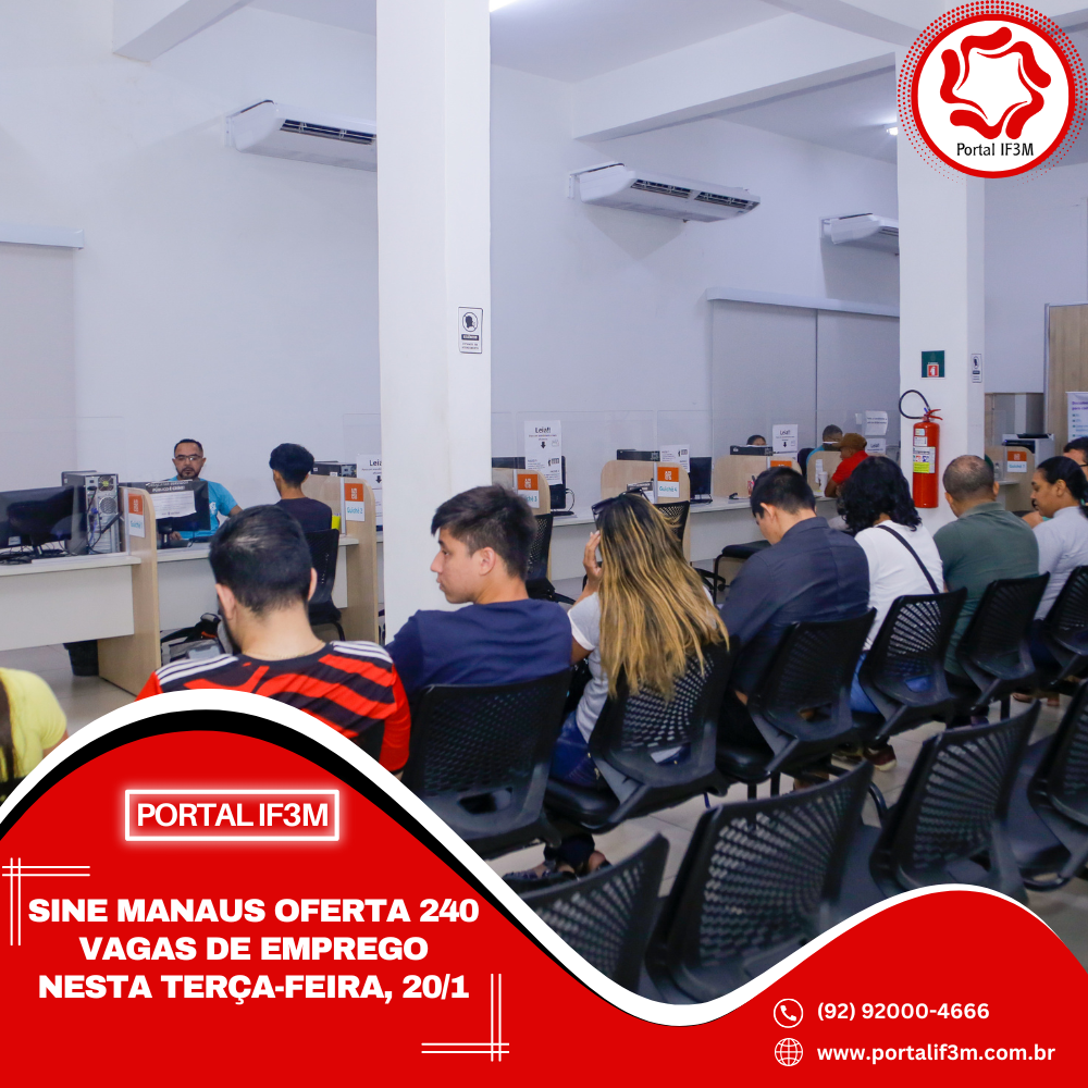 Prefeitura de Manaus, por meio do Sine Manaus, oferta 240 vagas de emprego em várias áreas de atuação, nesta terça-feira, 20/1, das 8h às 14h. O candidato pode validar a Carteira Digital e Previdência Social (CTPS) no aplicativo “Carteira de Trabalho Digital” ou acessar o site http://gov.br/trabalho.
