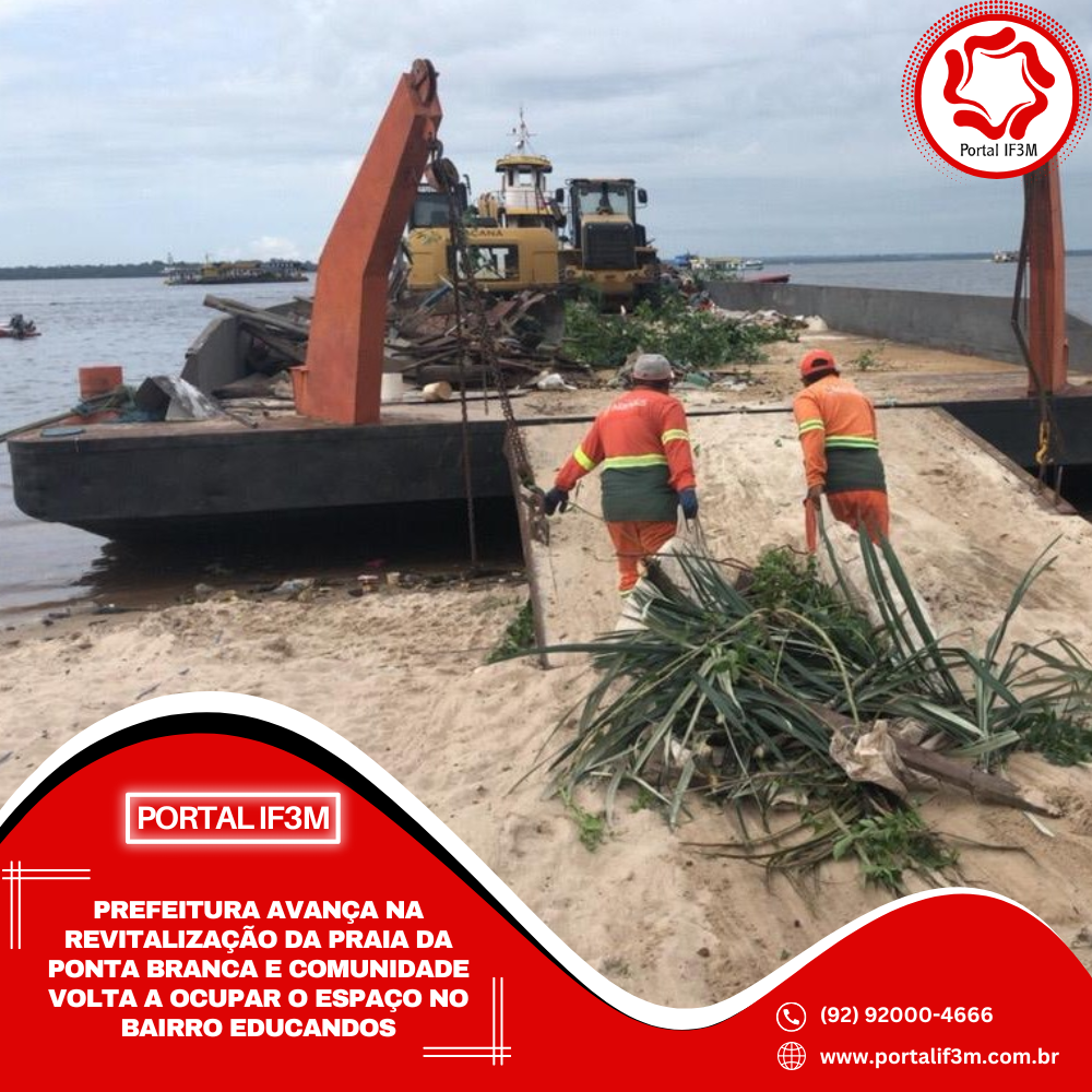 O trabalho de revitalização da praia da Ponta Branca, no bairro Educandos, zona Sul da cidade, segue avançando. Após a etapa inicial de limpeza pesada, com retirada de resíduos trazidos pelas águas do rio Negro e eliminação de focos de descarte irregular, a área começa a ganhar nova vida e já volta a ser ocupada pela comunidade. Os serviços são executados pela Prefeitura de Manaus, por meio da Secretaria Municipal de Limpeza Urbana (Semulsp).