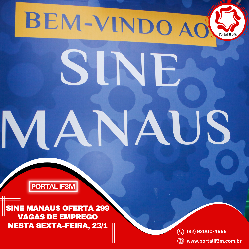 A Prefeitura de Manaus, por meio do Sine Manaus, oferta 299 vagas de emprego em várias áreas de atuação, nesta sexta–feira, 23/1, das 8h às 14h. O candidato pode validar a Carteira Digital e Previdência Social (CTPS) no aplicativo “Carteira de Trabalho Digital” ou acessar o site http://gov.br/trabalho.