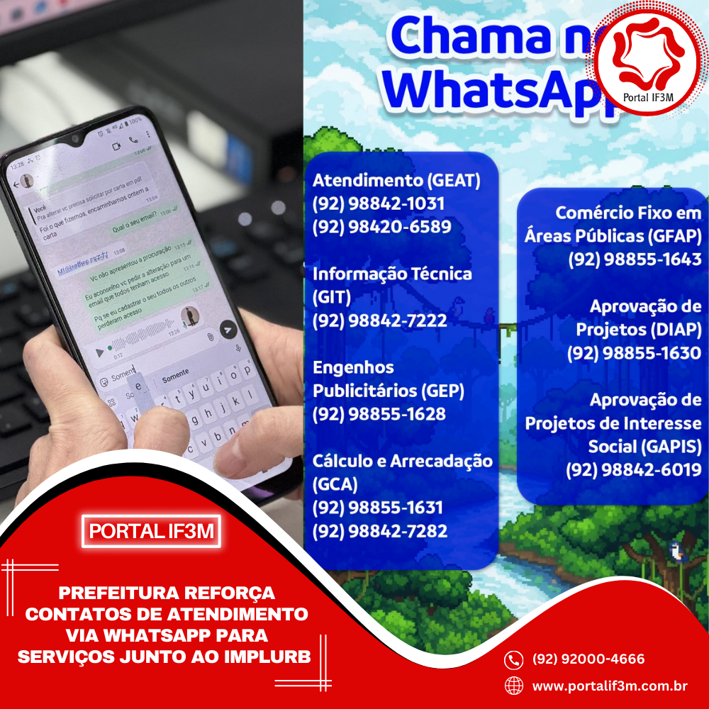 Para oferecer um atendimento mais ágil, acessível e em tempo real à população, a Prefeitura de Manaus dispõe de contatos diretos, via WhatsApp, do Instituto Municipal de Planejamento Urbano (Implurb). A medida visa facilitar o acesso a informações, esclarecimento de dúvidas, envio de documentações e acompanhamento de processos, garantindo mais eficiência na comunicação entre público e equipes técnicas do órgão.