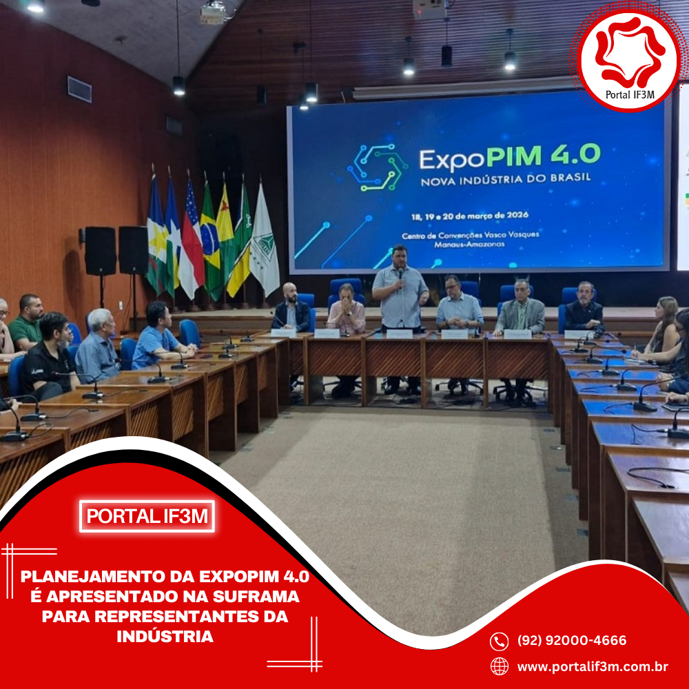 A Suframa e o Instituto Somar realizaram, na manhã desta quinta-feira (29), no auditório da Autarquia, apresentação sobre o planejamento da ExpoPIM 4.0 – “A Nova Indústria do Brasil”. O evento foi direcionado para representantes da indústria, do comércio e de instituições ligadas ao desenvolvimento regional. A ExpoPIM 4.0 2026 ocorrerá nos dias 18, 19 e 20 de março, no Centro de Convenções do Amazonas Vasco Vasques, zona Centro-Sul de Manaus.