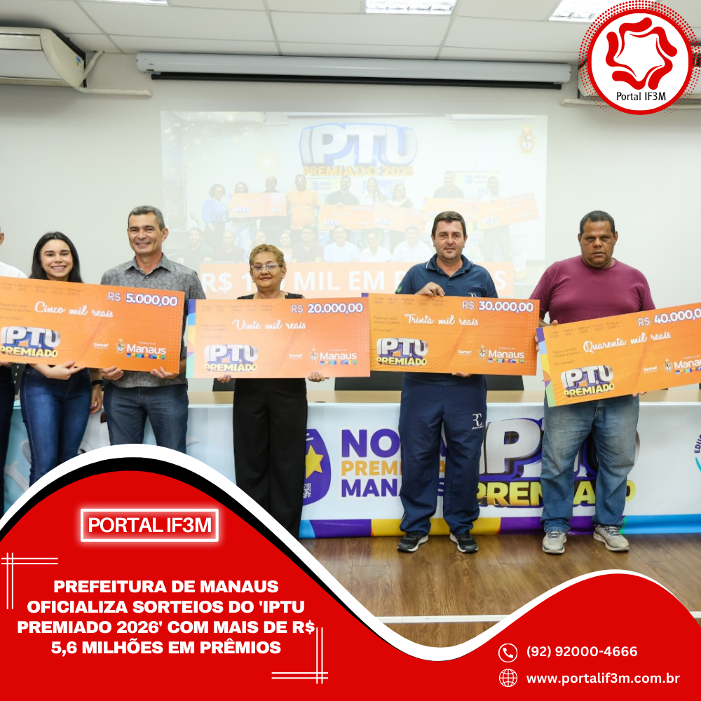 A Prefeitura de Manaus oficializou, por meio do Decreto nº 6.778, publicado no Diário Oficial do Município (DOM) da última terça-feira, 27/1, mais um ano de realização da Campanha de Incentivo ao Pagamento do Imposto Predial e Territorial Urbano (IPTU) 2026, conhecida como “IPTU Premiado”. De acordo com o texto, serão distribuídos 144 prêmios em dinheiro, totalizando R$ 5,670 milhões aos contribuintes que mantiverem o pagamento do seu IPTU em dia ao longo do exercício fiscal de 2026.