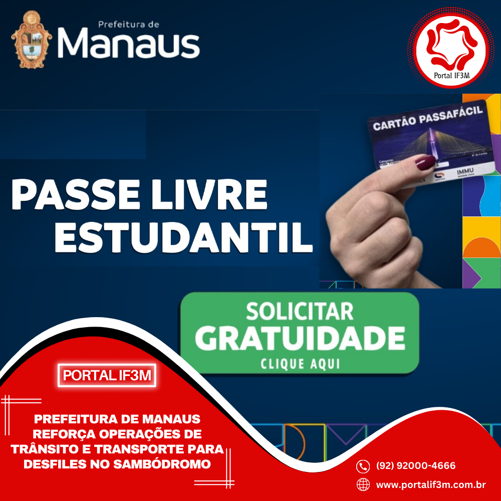 A Prefeitura de Manaus, por meio do Instituto Municipal de Mobilidade Urbana (IMMU), informa que já está liberada a solicitação dos créditos da gratuidade do transporte coletivo para estudantes. O pedido deve ser feito mensalmente e pode ser realizado de forma rápida e segura pelo aplicativo Sou Estudante Manaus ou diretamente pelo site estudantes.manaus.am.gov.br, mediante a informação do CPF do aluno.