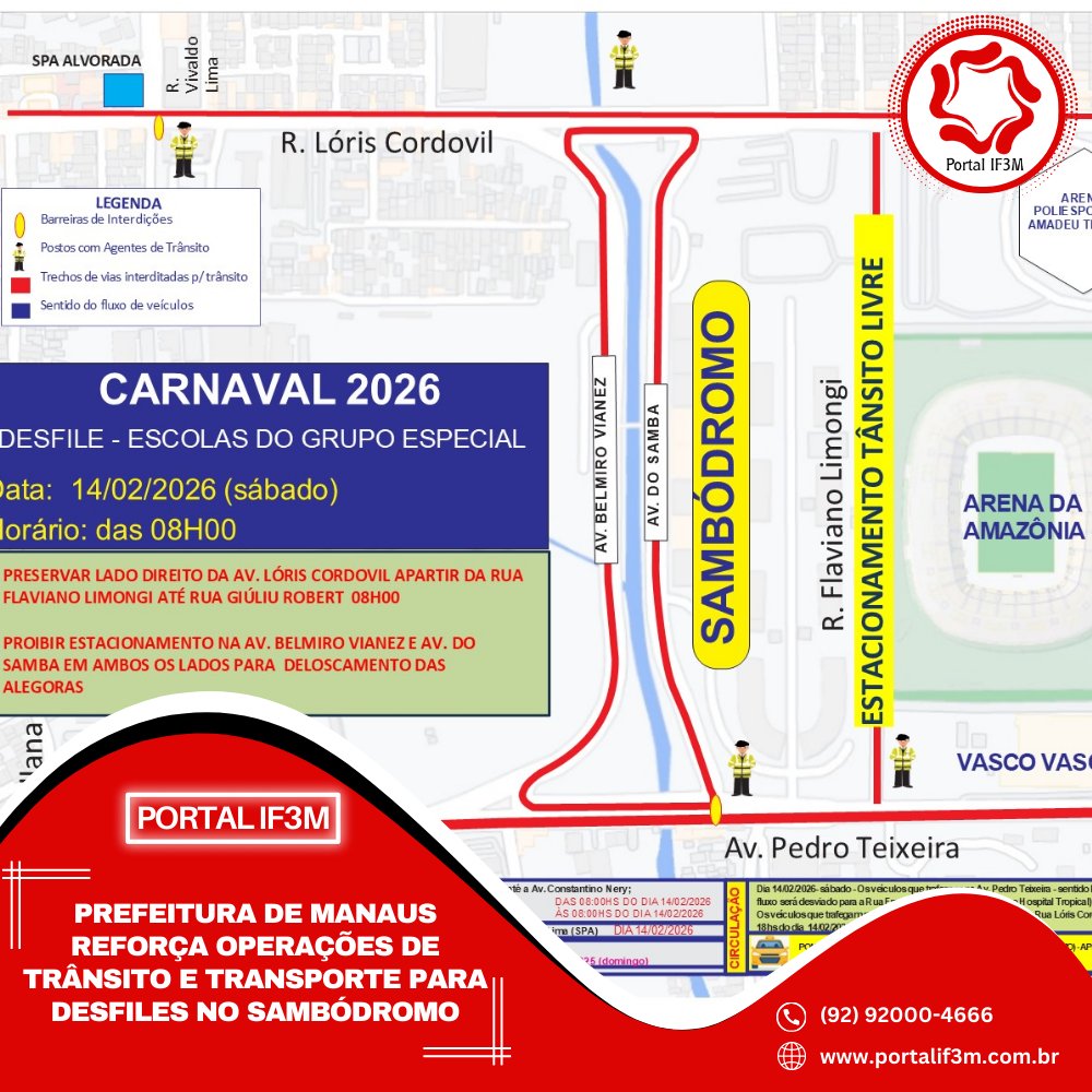 Nos dias 12 e 13, a rua Flaviano Limongi (entre a Arena da Amazônia e o sambódromo) estará interditada em toda a sua extensão. Nas avenidas Pedro Teixeira e Lóris Cordovil, haverá o fechamento de duas faixas à esquerda em trechos específicos, mantendo as demais para a circulação de veículos.