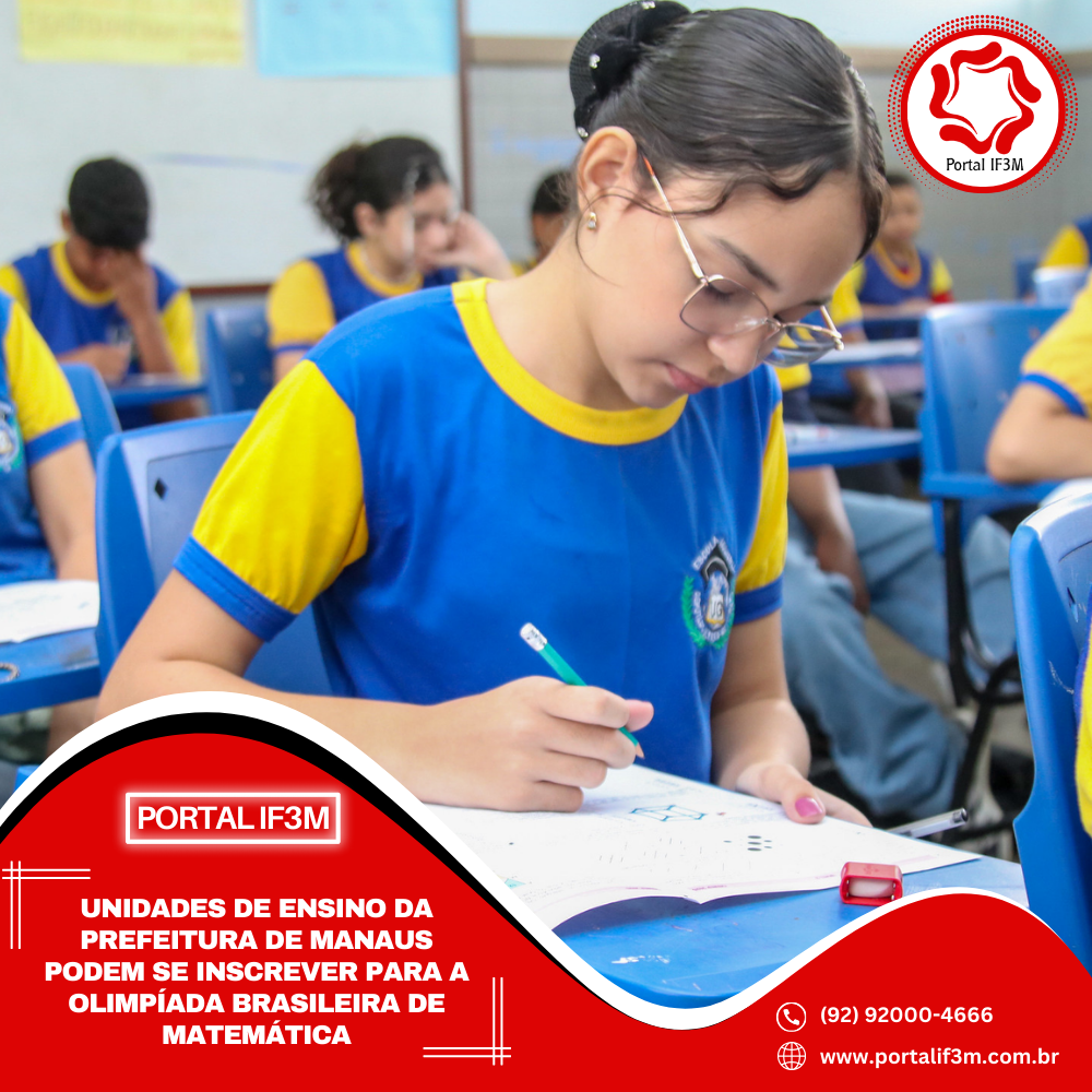 As unidades de ensino da Prefeitura de Manaus, coordenadas pela Secretaria Municipal de Educação (Semed), já podem se inscrever na 21ª edição da Olimpíada Brasileira de Matemática das Escolas Públicas (Obmep). O período de inscrições segue até o dia 16 de março de 2026 e deve ser realizado exclusivamente pela internet, por meio do site oficial: http://www.obmep.org.br/. Podem participar escolas municipais que atendem estudantes do 6º ao 9º ano do ensino fundamental.