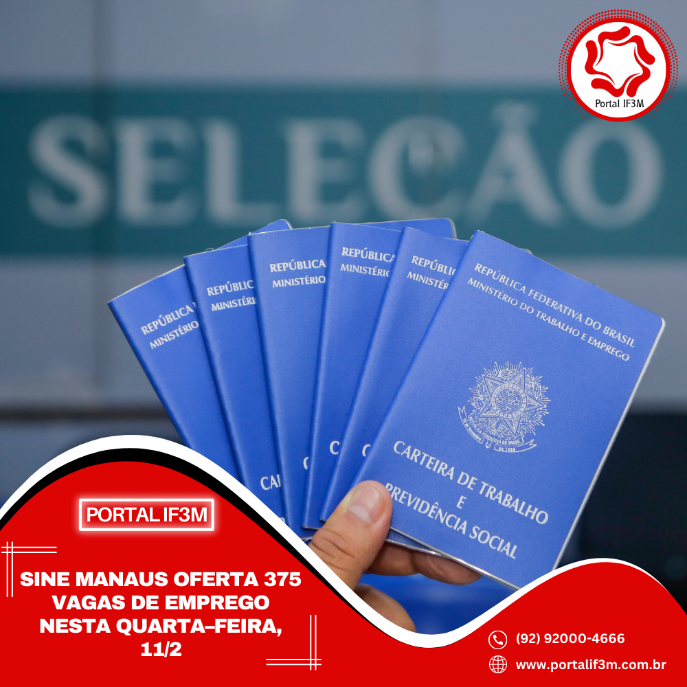 Prefeitura de Manaus, por meio do Sine Manaus, oferta 375 vagas de emprego em várias áreas de atuação, nesta quarta–feira, 11/2, das 8h às 14h. O candidato pode validar a Carteira Digital e Previdência Social (CTPS) no aplicativo “Carteira de Trabalho Digital” ou acessar o site http://gov.br/trabalho.