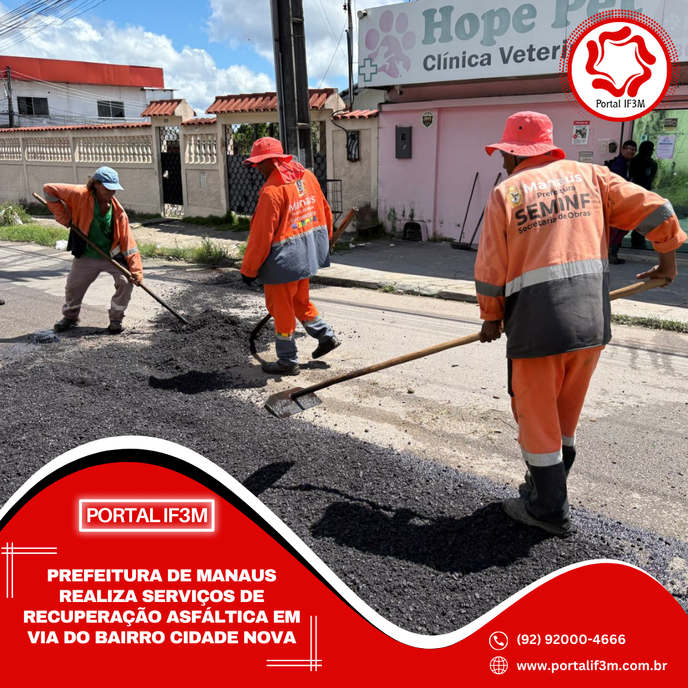 A Prefeitura de Manaus, por meio da Secretaria Municipal de Infraestrutura (Seminf), realizou, nesta quarta-feira, 11/2, serviços de recuperação asfáltica na rua Aracé, no conjunto Manoa, bairro Cidade Nova, zona Norte da cidade. A intervenção tem a finalidade de melhorar as condições de tráfego da área, garantindo segurança e bem-estar para a população.